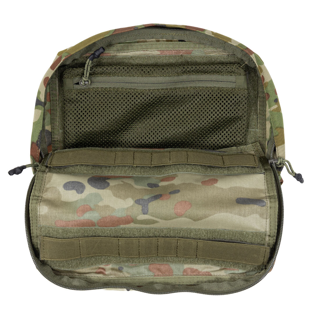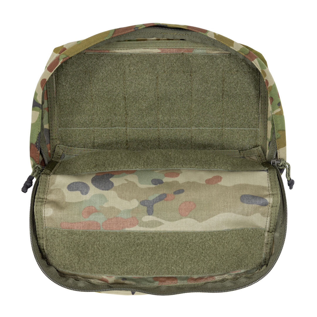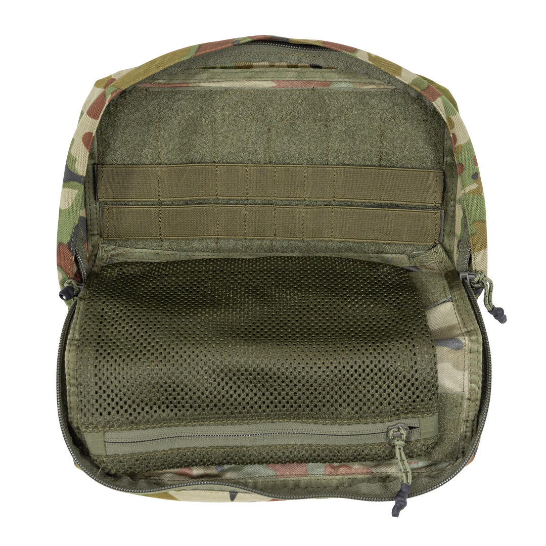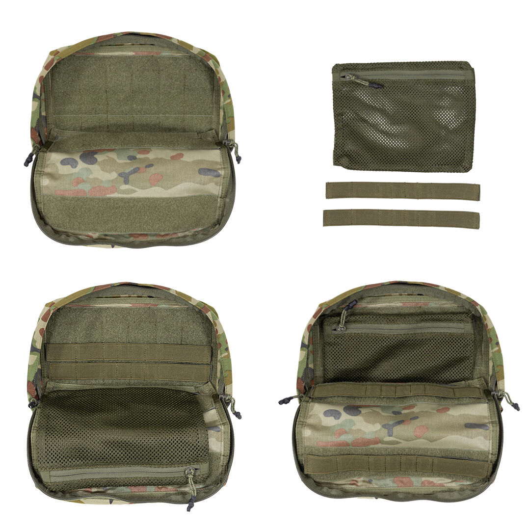 Inside, the pouch includes two removable Velcro-backed elastic retention strips and a removable mesh zip pocket, allowing users to configure storage based on task-specific requirements. A zip cover flap and drainage port at the base ensures performance in wet environments.