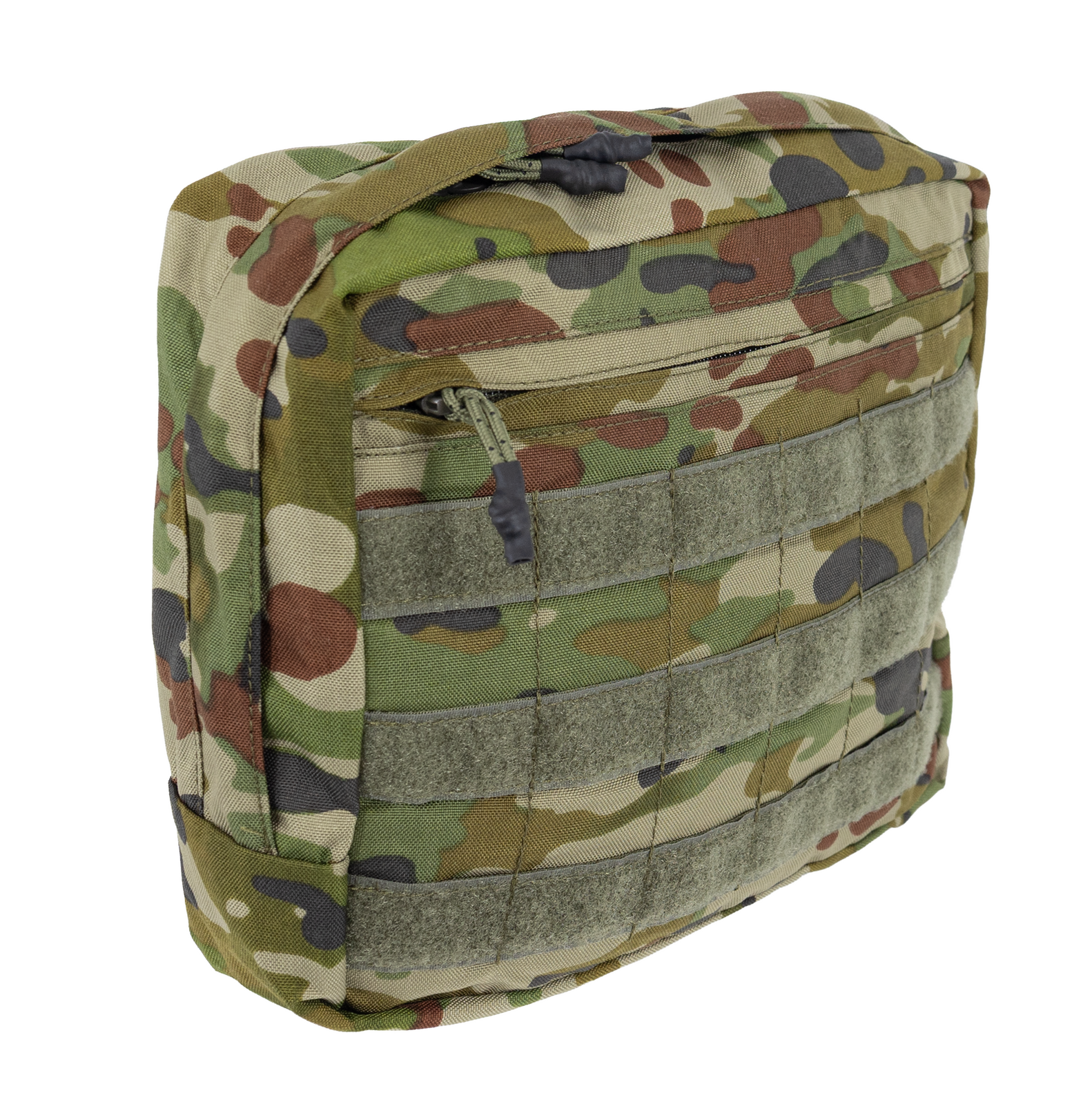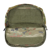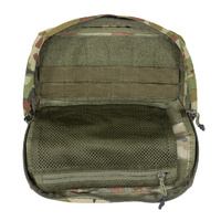 The pouch features a large front mounting surface with a 6 x 3 MOLLE grid and loop Velcro, allowing for additional pouch attachment, patches, or ID placement. A front zippered pocket offers quick-access storage, while the main compartment opens to a loop Velcro lined interior for modular organisation.