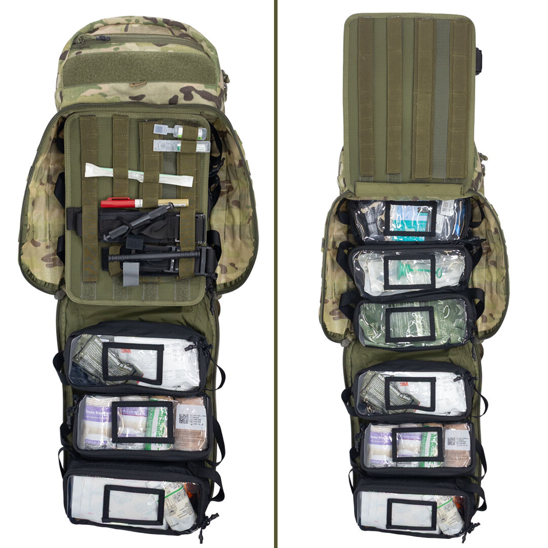 The front compartment is built for rapid access to an aid kit and contains six removable hook and loop backed pouches. Each pouch features a clear lid to allow quick identification of contents and a slot for a label card. This compartment also includes a fold out hook and loop lined board that can be configured with inserts to secure decompression pens, tourniquets and other similarly sized items, this board is mounted with a hook and loop sandwich and can be removed if not required.